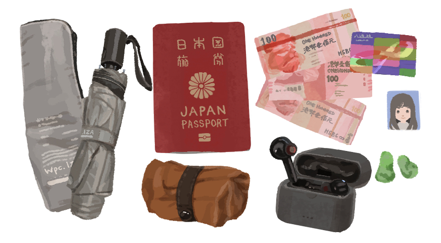 旅行でよく使う私物のイラスト。